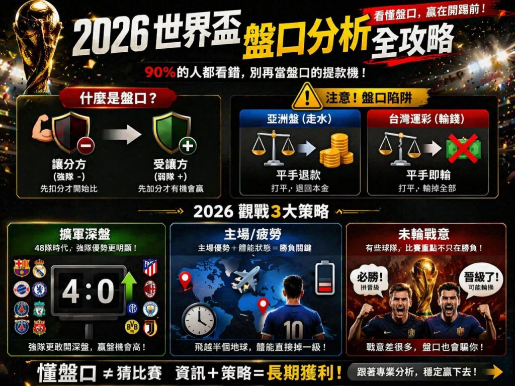 在 2026 FIFA 美加墨世界盃 這種高張力的足球賽事中,理解盤口邏輯是獲利的起點。